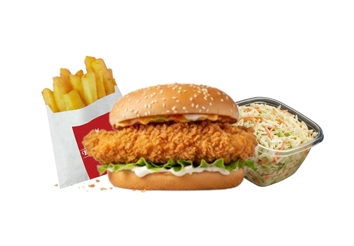 Crispy zinger chicken fillet topped with lettuce, mayonnaise, and cheese, served with coleslaw, French fries, and dips